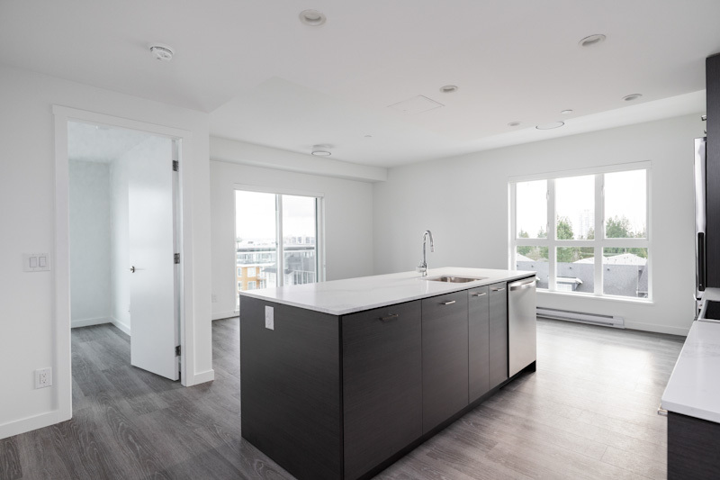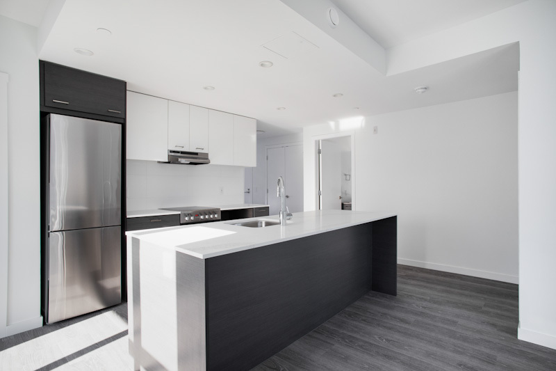 Our largest 2-bedroom plan, the D4 plan sits at 840sqft. With an 8ft long kitchen island, you have copious amounts of prep space, all while doubling as a breakfast far. Fitted with low-energy appliances, LED lights and beautiful quartz counters, this kitchen is modern and sleek. The ideal space for roommates, or families as both rooms are on opposing sides and provide a great deal of privacy. This corner suite offers large windows and natural light all year round.