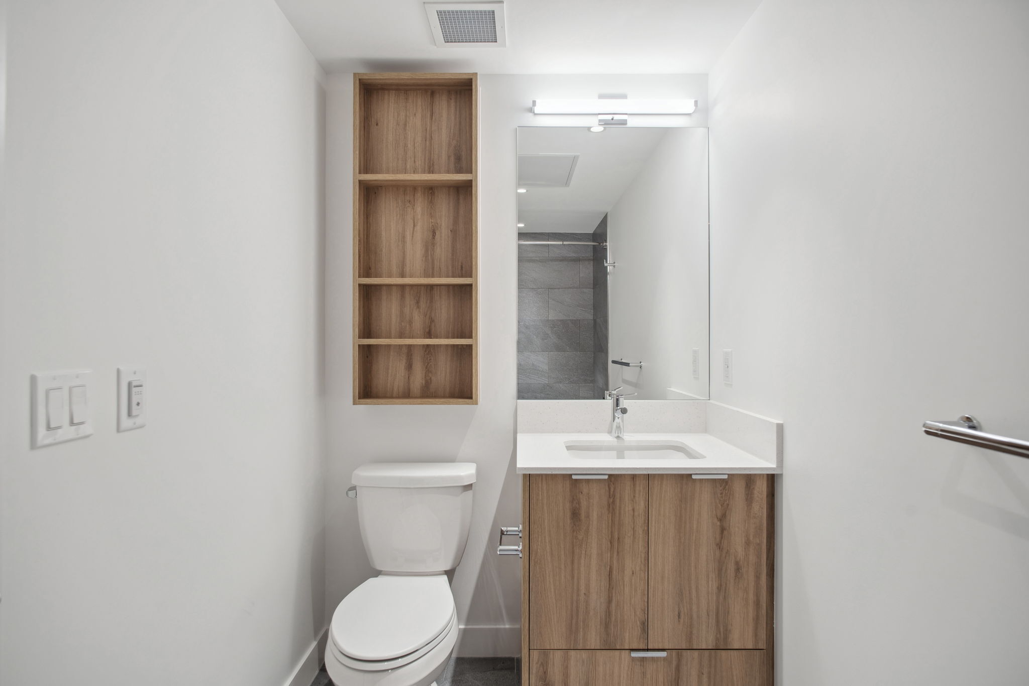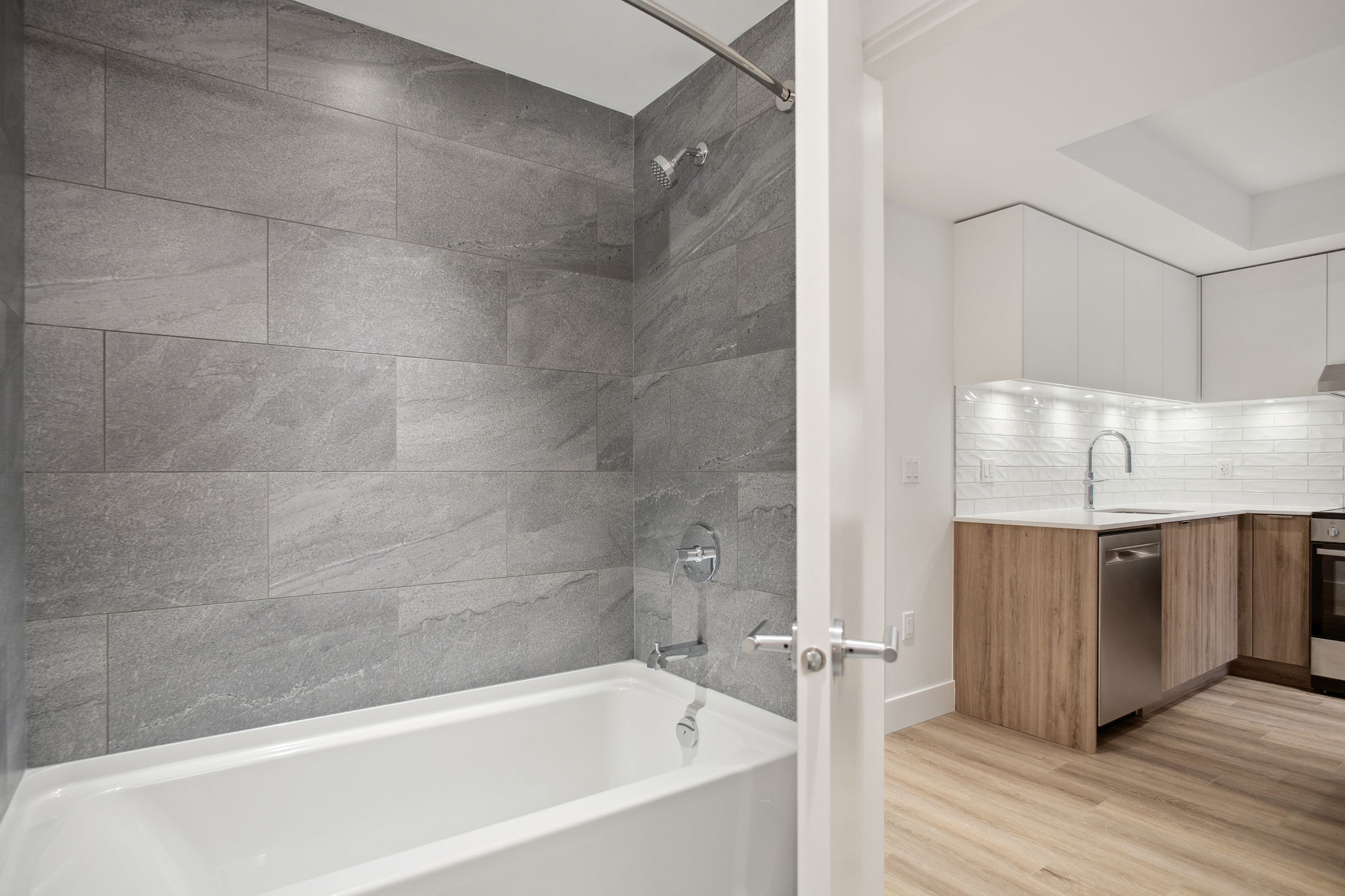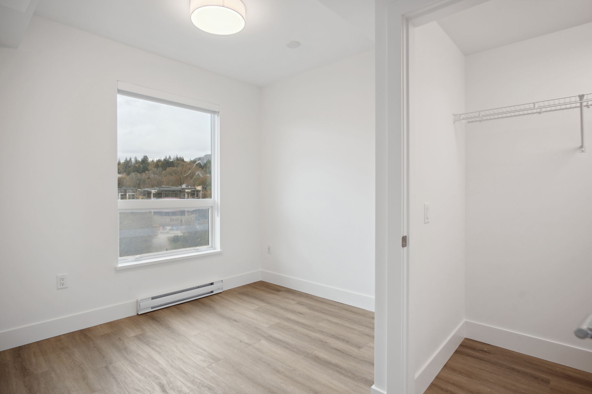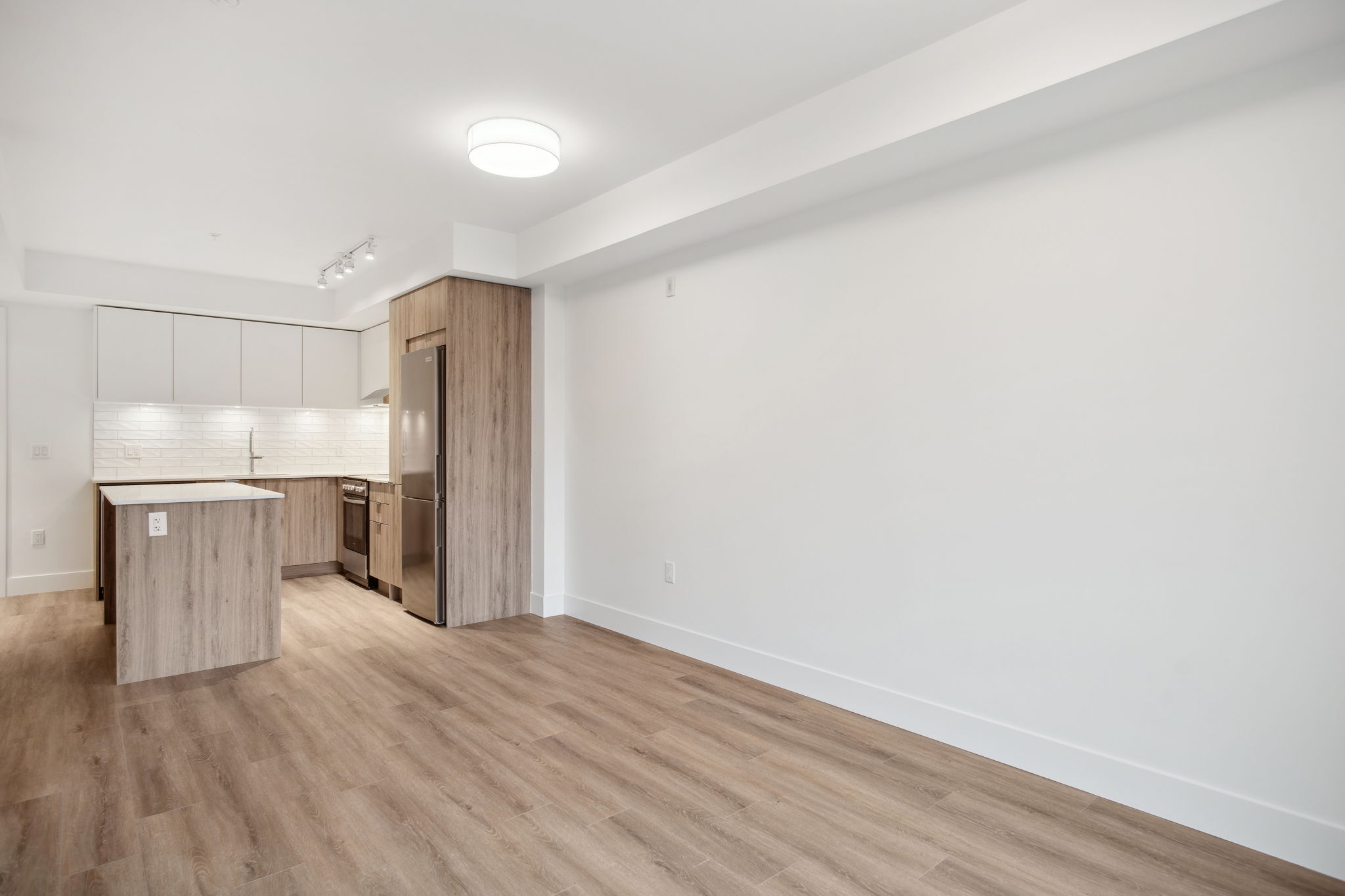 Our B2 layout offers a large corner kitchen with an island offering plenty of countertop and storage space. With natural finishes, the suite is light and airy. An open concept living space allows you to furnish your suite to fit your needs. All suites include mountain views, in-suite laundry, dishwasher and A/C.
