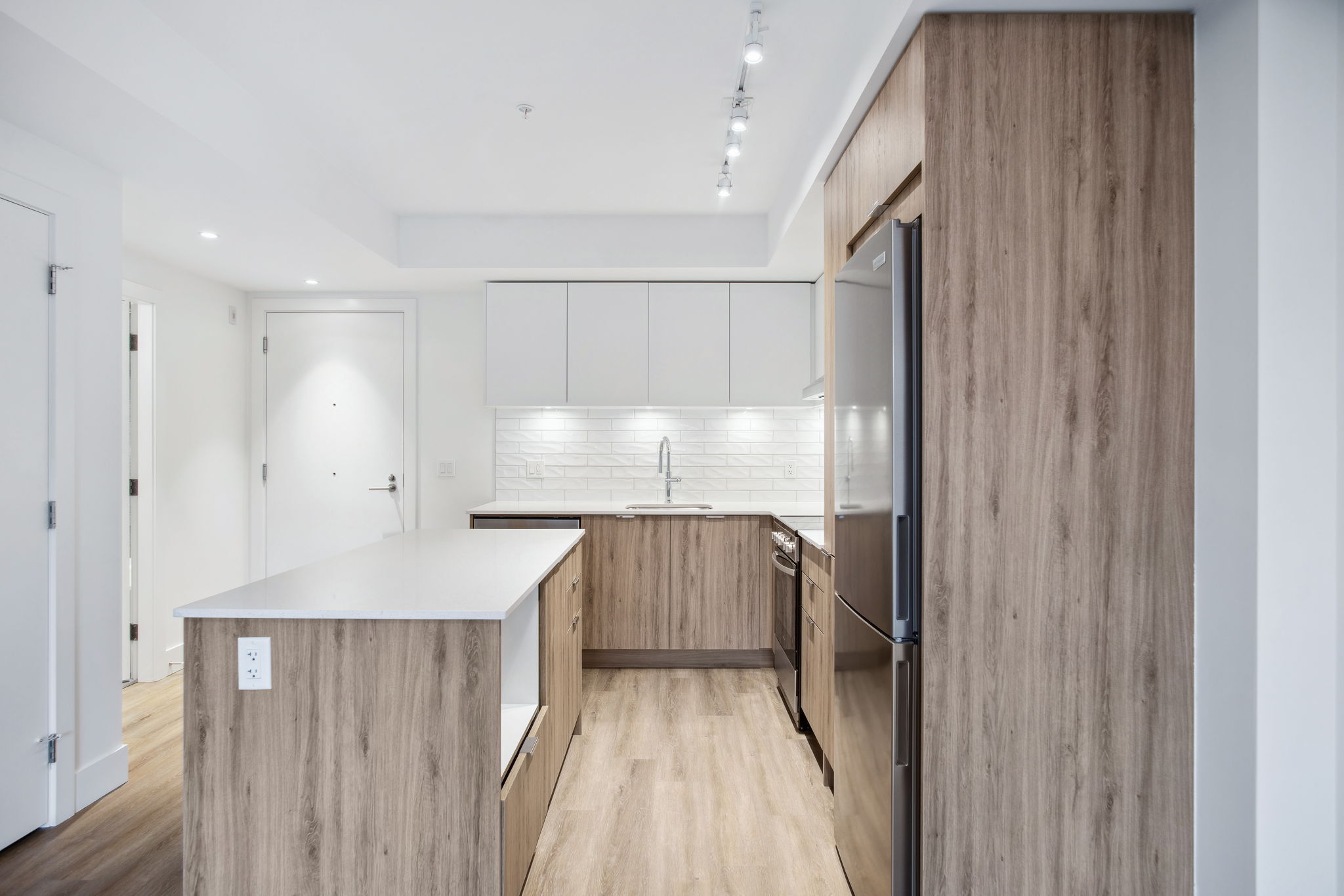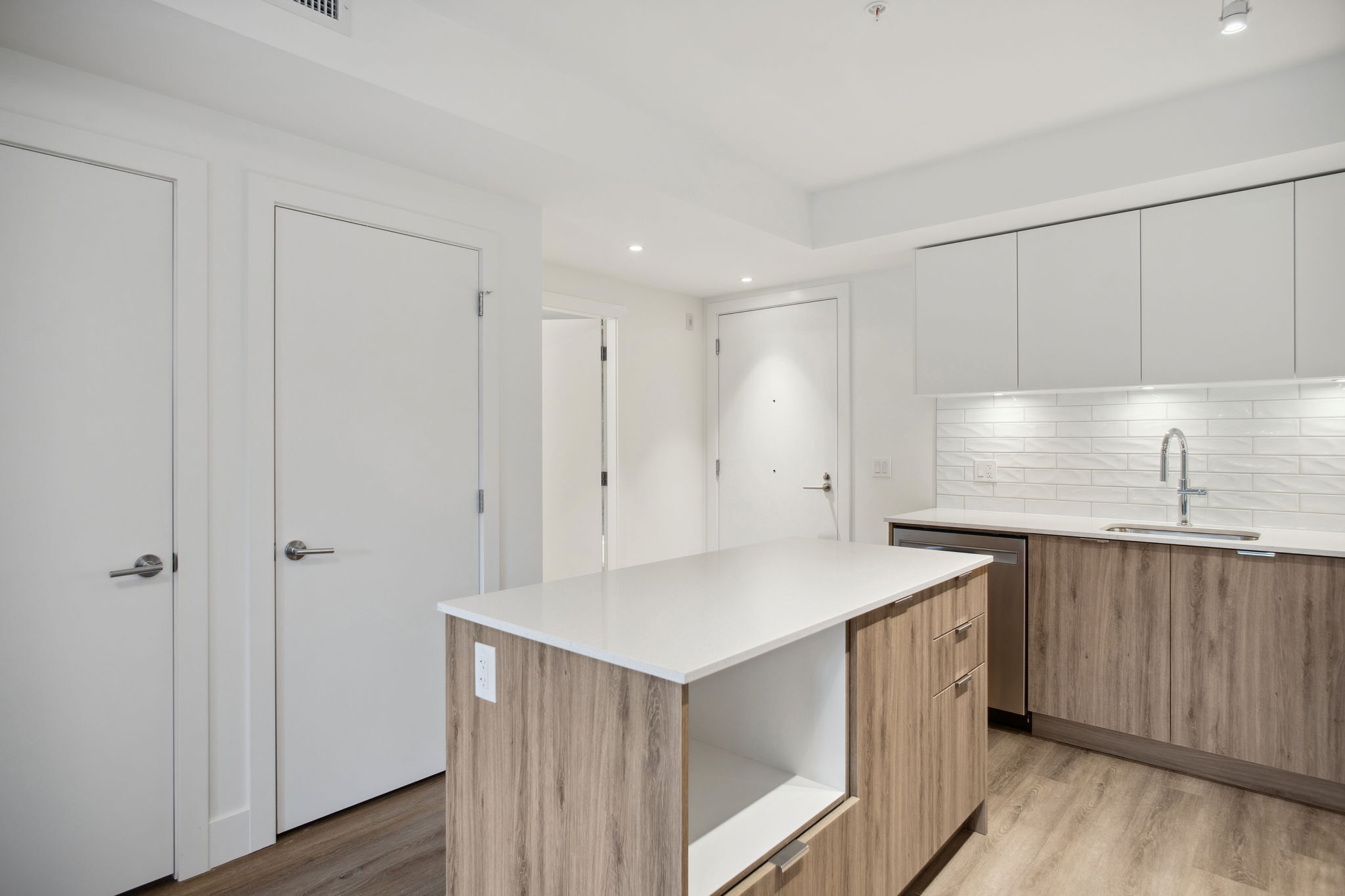 Our B2 layout offers a large corner kitchen with an island offering plenty of countertop and storage space. With natural finishes, the suite is light and airy. An open concept living space allows you to furnish your suite to fit your needs. All suites include mountain views, in-suite laundry, dishwasher and A/C.