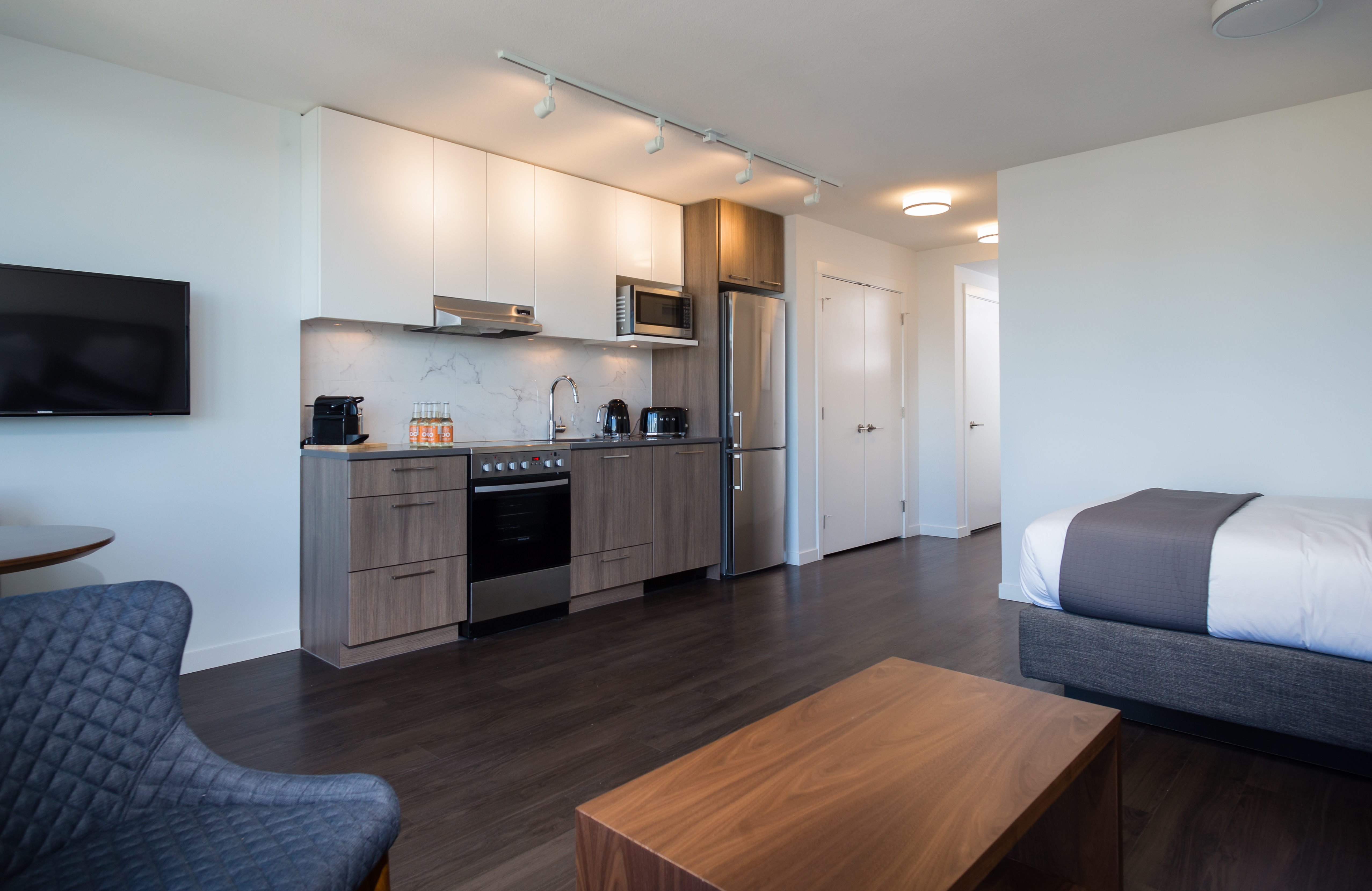 Our A3 studio plan is the largest of our studio suites, it also includes a separate office or flex space. The suite features modern finishes including: stone countertops, vinyl plank floors and a full appliance package. Relax on the west-facing balcony and take in the amazing views of Downtown Vancouver, the mountains, and ocean.