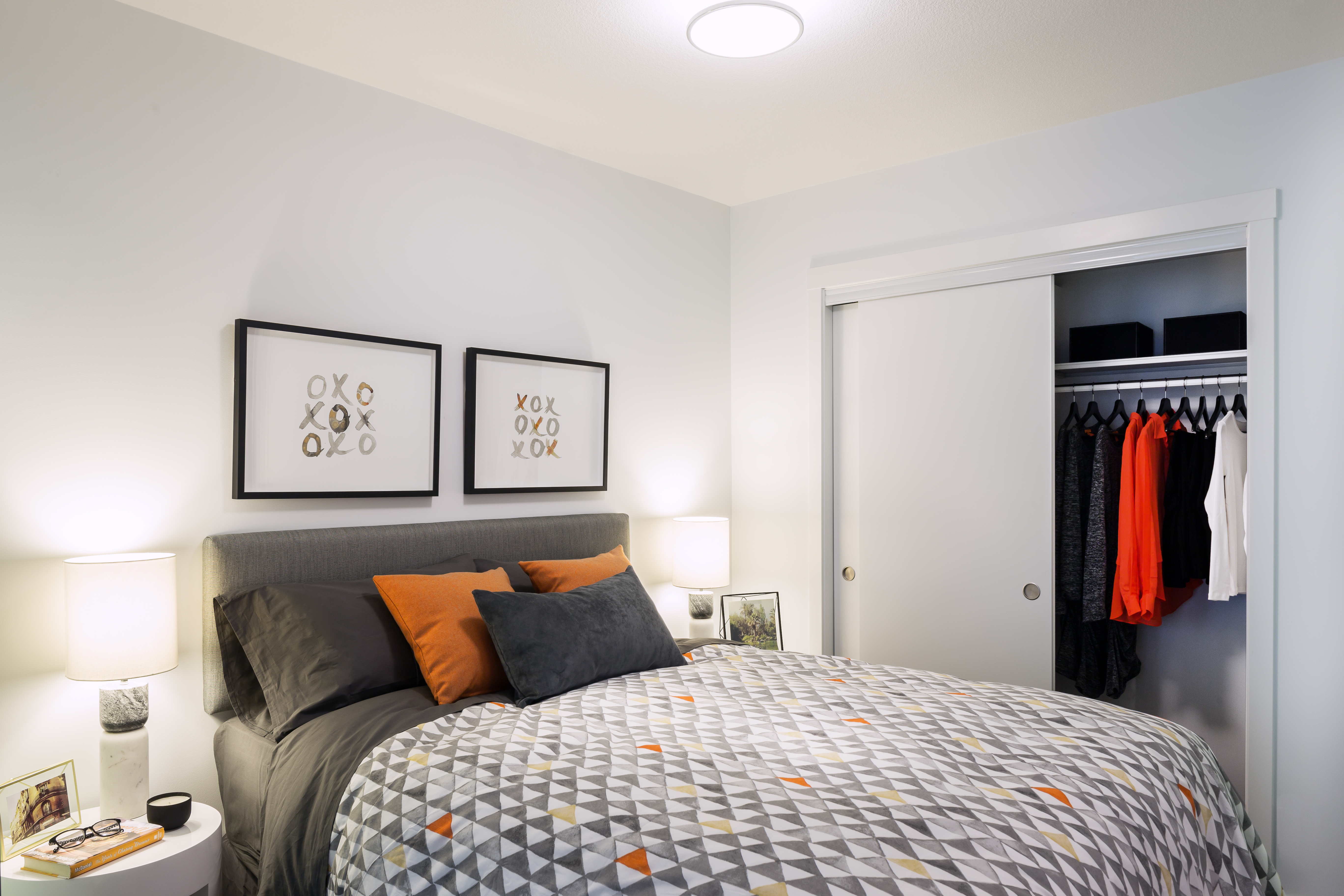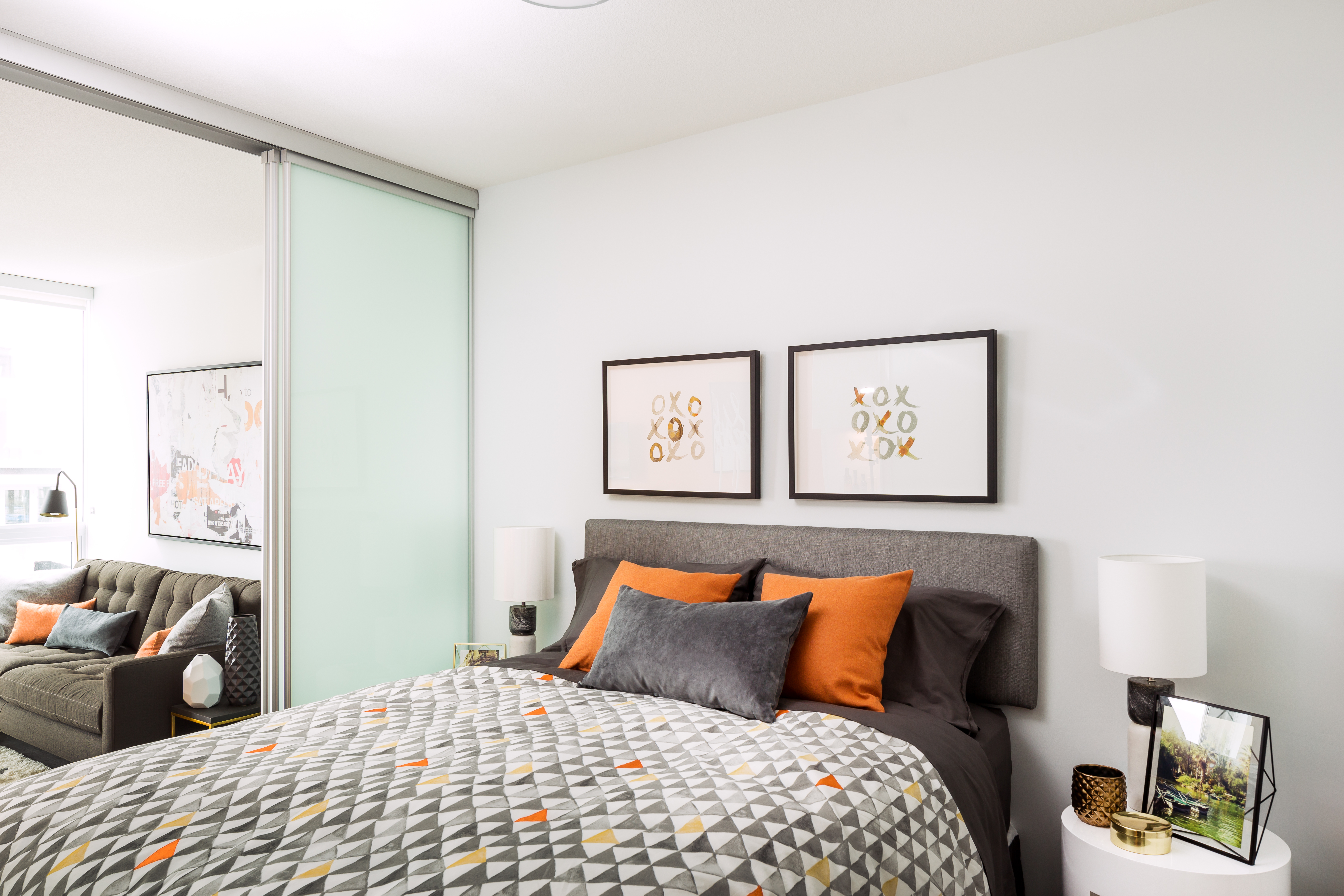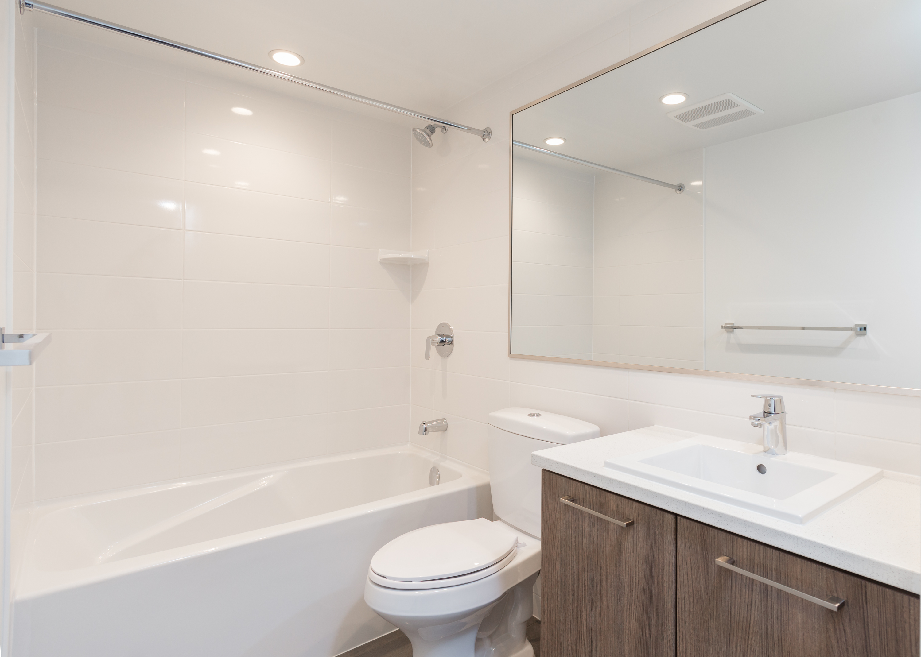 This suite allows for maximum flexibility with a separate office or flex space, and transforming walls that move to fit your needs. The suite features modern finishes including: stone countertops, vinyl plank floors and a full appliance package. Located on the north-west side of the building, this suite faces out to our tranquil 2nd floor garden level on the lower floors, and offers views of the North Shore mountains, Downtown Vancouver, and peek-a-boo ocean views on the upper floors.